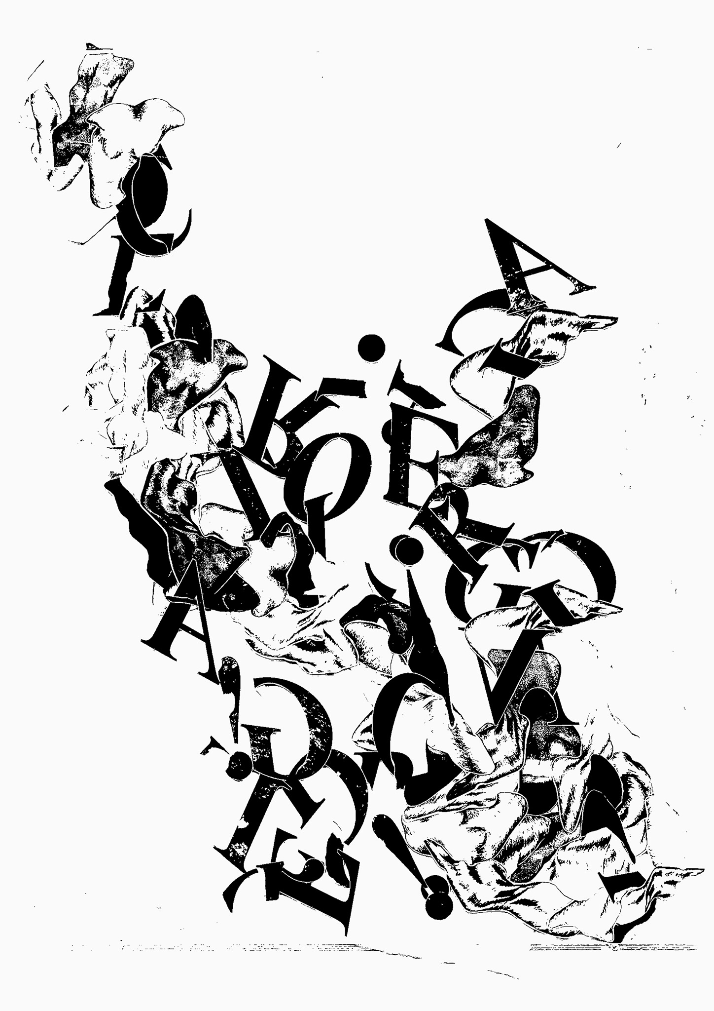 Nuzzo created Textual Space in a Biomorphic Field from a collage made using waste. For previous work, Nuzzo had made inkjet print letters and dye sublimation prints of figurative drawings to create a heat press collage. She piled these in her studio with the intent to throw them away, and then realised that the pile had become a work in itself. With these, Nuzzo created a collage within two sheets of plexiglass, then digitally captured them to create a new, fully-flat piece. This piece is a play on the ever-evolving relationship between Nuzzo’s work in its flat and multi-dimensional states.