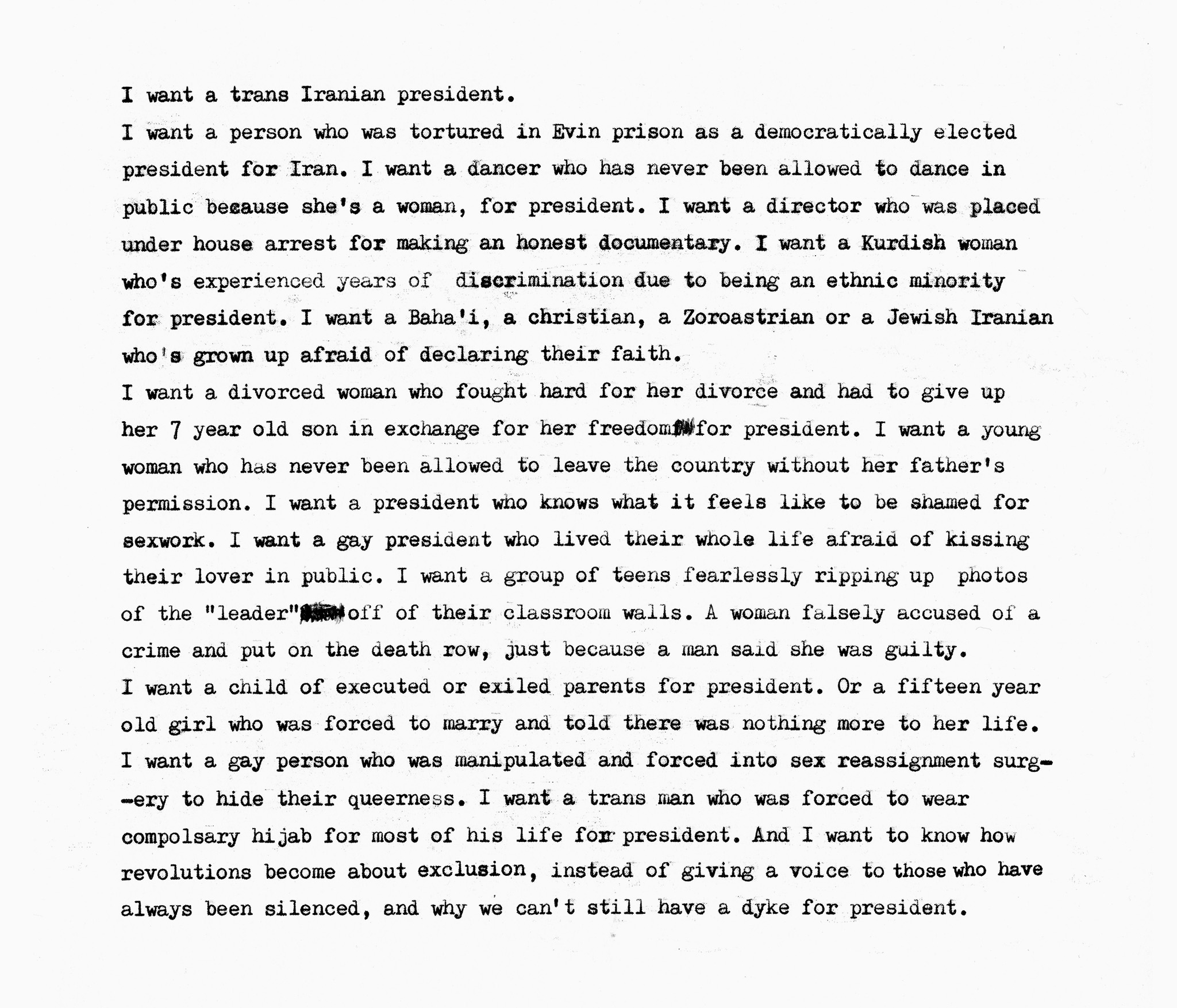Inspired by Zoe Leonard’s I Want a Dyke for President, Jalilipour wrote this text as the stories of Iran’s revolution took over their social media and their life, with many LGBTQ people in Iran photographing themselves in public kissing and holding pride flags. For months it became all that Jalilipour could think about, wondering what will happen, and what it would mean for them and people like them: queer people in Iran and in the Iranian diaspora. The revolutionary statement that “we want a trans president” seems like an impossible dream, but for Jalilipour, the only future for Iran is one that includes queer and trans people. This statement must also be applied universally in resistance to global threats to LGBTQ rights and leadership, responding to the many countries rolling back trans rights, female leaders resigning their posts, and the death of the first transgender mayor in the world, Georgina Beyer.