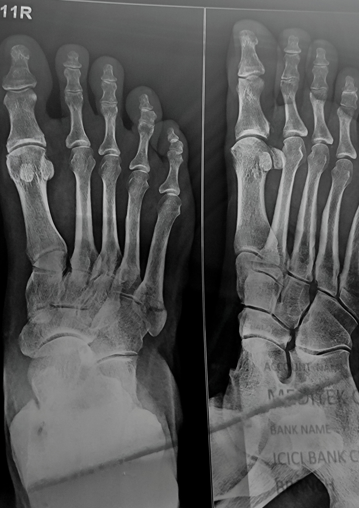 An x-ray of Roychowdhury’s mother’s foot after a fracture. Held up against a light box inside the clinic, a portion of the clinic’s bank details are visible in the lower right corner, highlighting the capitalist “skeleton” of healthcare—a basic human right.